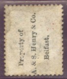 The example below is PP89 a 1d. red (SG 43 or G1) Plate 99 with a Property of A. & S. Henry & Co. Belfast. underprint, reading upwards.