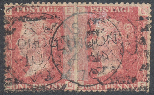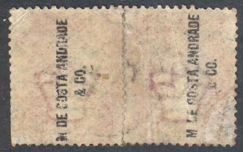 The example below is a rejoined pair of PP64 a 1d. lake-red (SG 43 or G1) Plate 112 with the M. de Costa Andrade & Co. type 22 underprint.