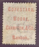 The example below is PP23 a 1d. lake-red (SG 43 or G1) Plate 150 with a Copestake, Moore Crampton & Co., London type 12 underprint.