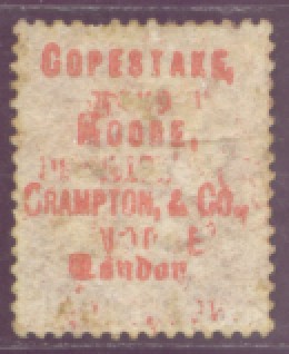 The example below is PP36c a 1d. lake-red (SG 43 or G1) with a double Copestake, Moore Crampton & Co., London type 15 underprint. Note. The catalogue numbering is my own as this underprint variety is currently unlisted by Stanley Gibbons. Normal "double underprints" show a complete double strike of the underprint just off true, giving a blurred effect. The above example however shows a partial second overprint offset vertically by quite some distance. In the above example the partial underprint is offset vertically by almost exactly half the stamp such that the "Copestake" appears across the centre of the stamp under the complete "Moore". The last line of the partial underprint (the "London.") wraps round to the top of the stamp, appearing just below the complete "Copestake".
