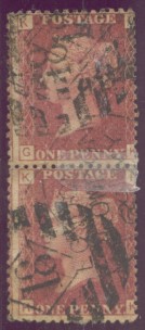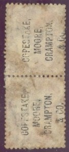 The example below is PP46 a 1d. lake-red (SG 43 or G1) Plate 123 vertical pair with a Copestake, Moore Crampton & Co., London type 17 underprint reading upwards.