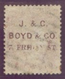 The examples below are both PP11 a 1d. rose-red (SG 40 or C10) plates unknown with the J. & C. Boyd & Co. type 5 underprint. Note. There is a marked variation in shade between these two underprints. The first shows a fairly normal red underprint while the second a much darker brown-red. This appears to be quite common for the unofficial J. & C. Boyd & Co. underprint type 5.