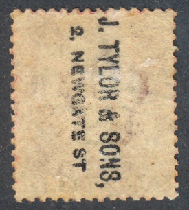The example below is PP197 a 1d. lake-red (SG 43 or G1) Plate 144 with the J. Tylor & Sons. 2 Newgate St. type 59 underprint, reading downwards.