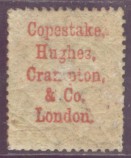 The example below is PP52 a 1d. lake-red (SG 43 or G1) Plate 196 with a Copestake, Hughes Crampton & Co., London type 18 underprint.