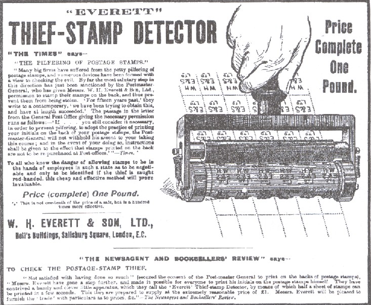 This underprint is from the firm W. H. Everett & Son Limited. They traded from: Bell's Buildings, This underprint was applied to the stamps of both King Edward VII and King George V. The underprints were applied with a hand roller invented by Everett’s and offered for sale as the “Everett” Thief-Stamp Detector for £1. The device consisted of a rubber roller on which were arranged 36 (6 x 6) underprinting dies. Because of the manner of application underprints are rarely centred very well and appear inverted as well as upright. Everett advertised their roller as the Everett Thief-Stamp Detector as shown below.