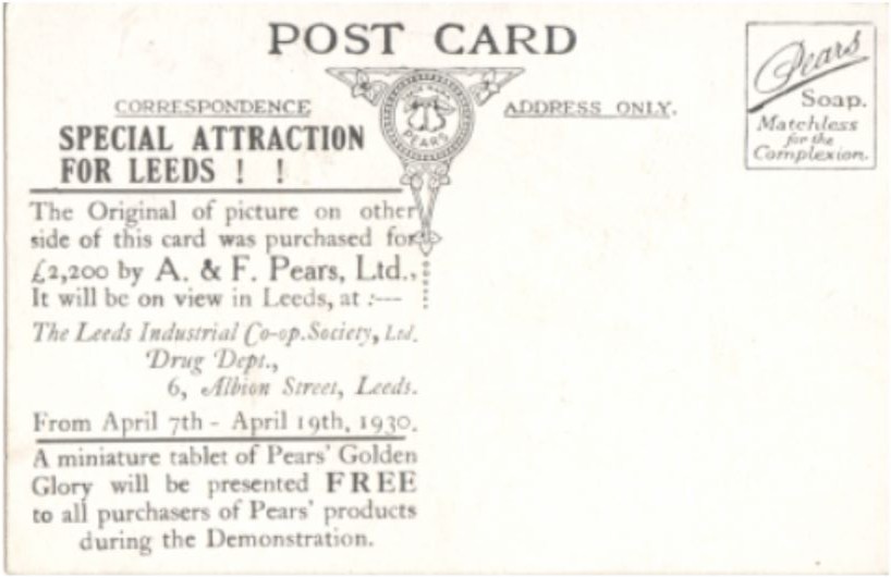A. F. Pears Ltd. the soap manufacturer, used the above picture (BUBBLES by Sir John Millais) as their main advertising symbol. The above image is taken from a postcard of the 1930's. The reverse of the card advertises the fact that the original painting, purchased by A. & F. Pears. Ltd., was to be on display for a period of time in a Leeds store. During the reign of Queen Victoria a number of British stamps were produced with an advertisement for the firm in the form of an underprint. These underprints appeared on the 1881 1d lilac with 16 dots (S.G. 173) and the 1887 1/2d vermilion (S.G. 197) shown below: